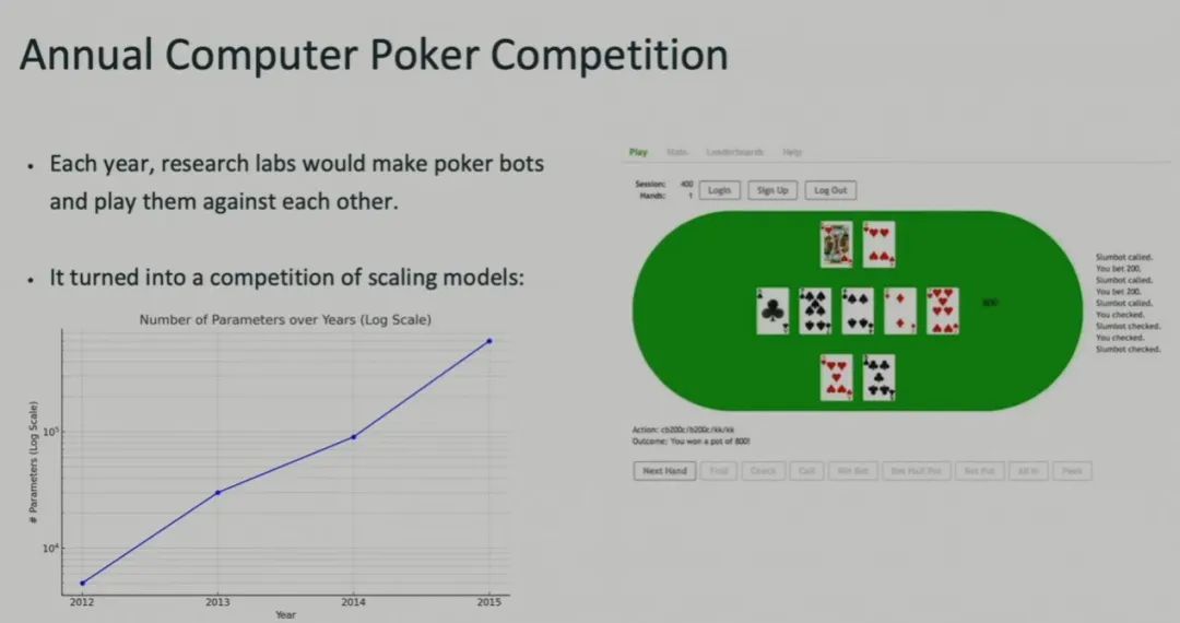 那几年,各个研究扑克 AI 的实验室都会训练更大的新模型来互相竞赛。这就是当时的年度计算机扑克竞赛。