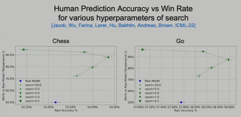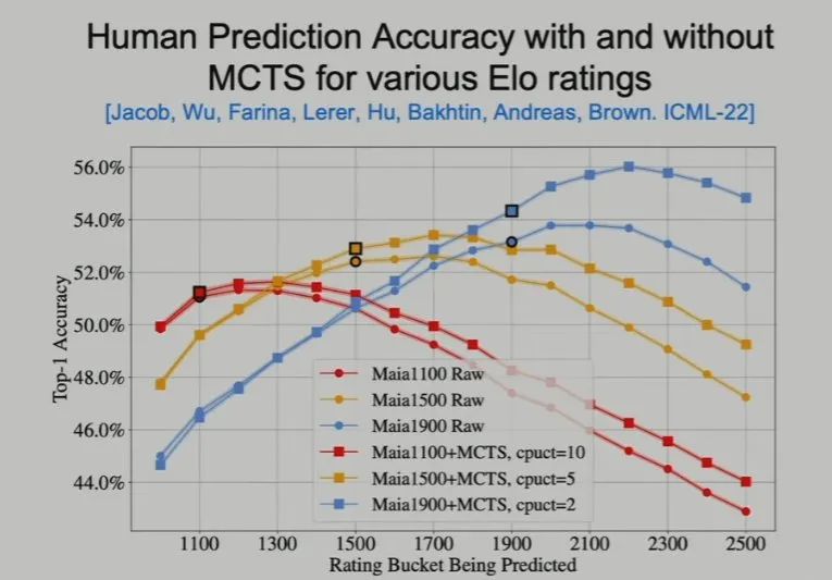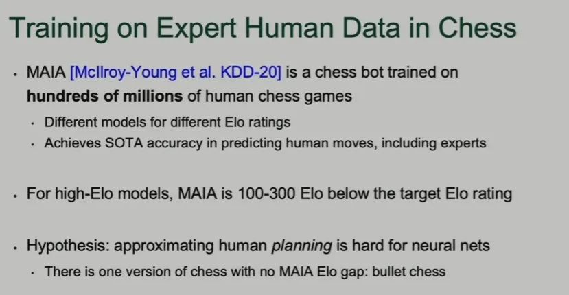 接下来,Brown 介绍了一个在国际象棋比赛上模仿人类专家数据的研究。这个名叫 MAIA 的国际象棋 AI 在 Elo 较高时比目标 Elo 分数低 100-300 分。也就是说,如果使用 2000 分的人类数据来训练它,它自己却只能得到 1700 分。但 MAIA 在有一种情况下能与人类专家持平,也就是快棋赛——这时候人类没有足够的思考时间。因此,这可能表明神经网络难以近似人类的规划能力。