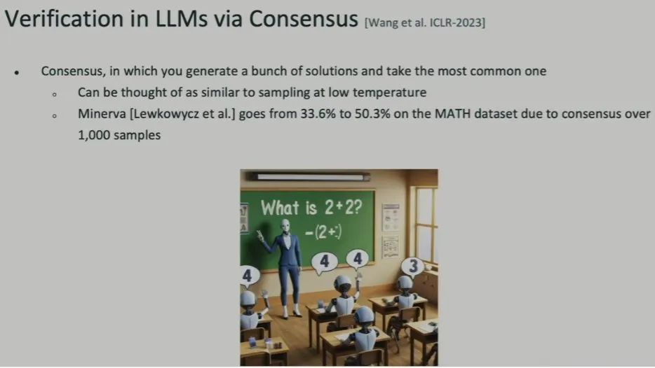 有一种名为 Consensus(共识)的算法是这样执行验证的:让 LLM 生成多个解,然后选择出现次数最多的那个。
