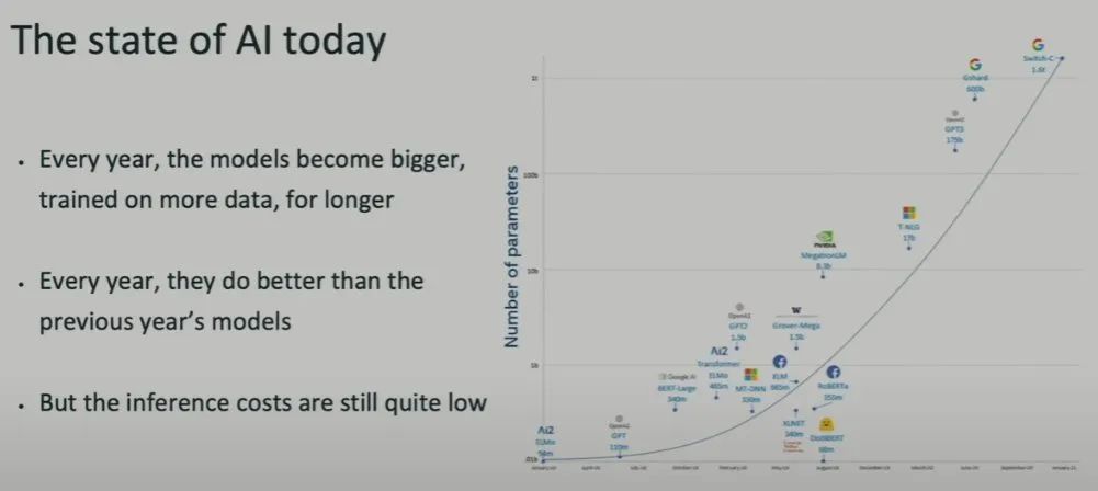 接着,Brown 话锋一转,分享了当今的 AI 图景。请注意,由于这次演讲发生于 2024 年 5 月 23 日,因此其中并没有最新的模型。但他谈到的发展趋势依然很有价值。