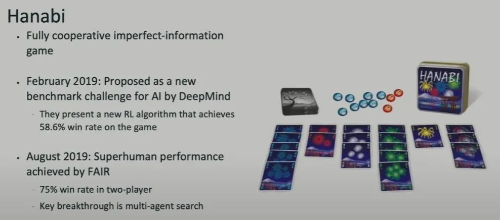 2019 年 2 月,DeepMind 为 Hanabi 提出了一个新基准,并且他们提出了一种可取得 58.6% 胜率的强化学习算法。