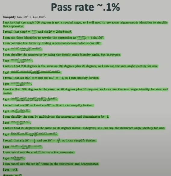 Brown 举了一个非常有趣的例子。让LLM 解决这个数学问题:化简 tan100° + 4sin100°。