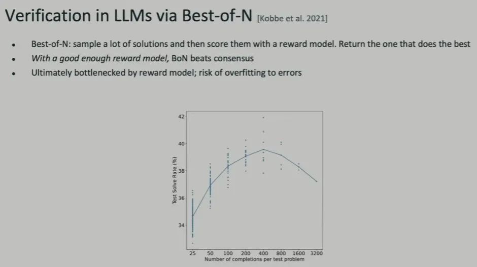 另一种方法是 Best of N。这需要用到一个奖励模型来为生成的 N 个答案打分,然后返回最佳结果。这种方法的表现依赖于奖励模型的质量。如果奖励模型质量不行,就可能出现在错误上过拟合的问题。