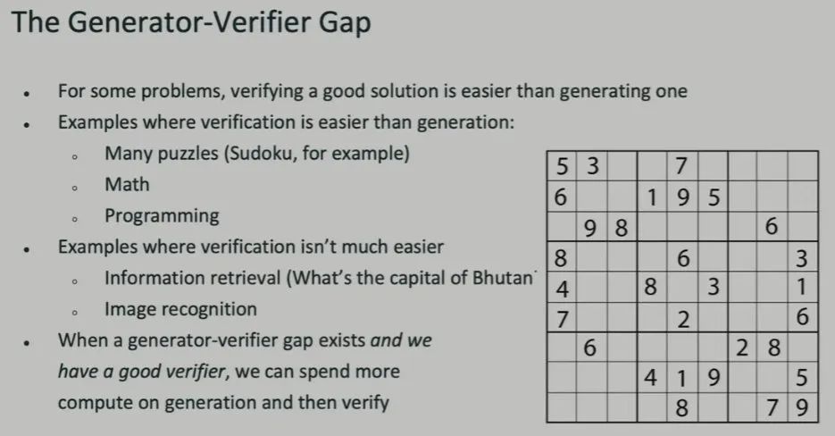 因此,当存在「生成器-验证器差距」且具有比较好的验证器时,我们可以将更多计算放在生成上,然后验证结果。