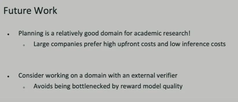 规划是一个相对较好的研究领域,对资源不丰富的学术研究者来说,这个方向避开了与大公司的正面竞争,或许更容易出成果。因为大公司基于利益考虑,更愿意训练超大模型,同时尽可能地降低推理成本,以便为大量用户提供服务。