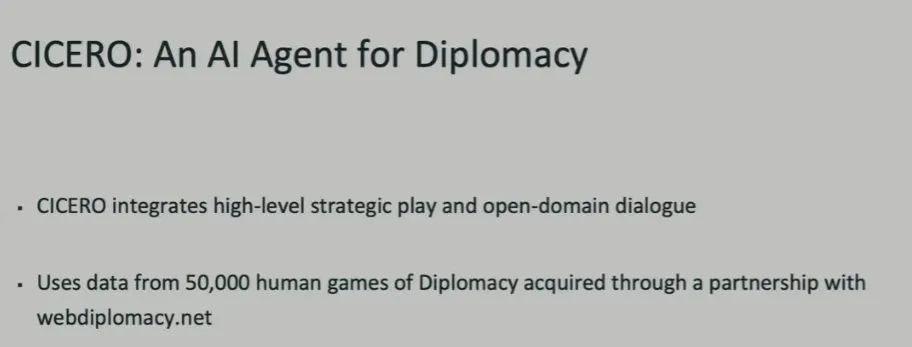 接下来,Brown 介绍了他在 FAIR 时开发的一个用于外交游戏 Diplomacy 的 AI 智能体 Cicero,这是首个在外交策略博弈任务上达到人类水平的 AI。参阅机器之心报道《