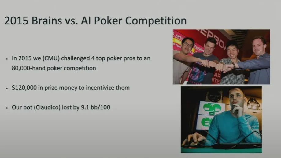 2014 年时,Brown 与其导师一起开发了当前最强大的扑克 AI,取得了竞赛第一名。那时候他们开始尝试在实际的比赛中与专家级人类对抗。于是在 2015 年,他们举办了人脑与 AI 扑克竞赛。