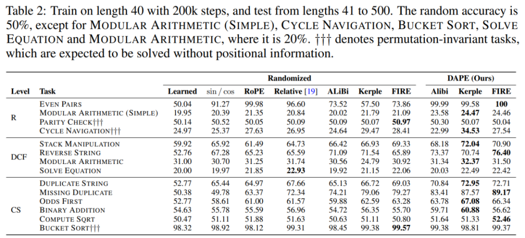 DAPE 在需要位置信息的任务中表现更好。DAPE(与 Kerple 和 FIRE 结合)在 11 项需要位置信息的任务中有 10 项表现最佳,并在 Solve Equation 任务中取得了第二好的表现。这凸显了 DAPE 通过语义适应性处理需要位置信息的任务的有效性。