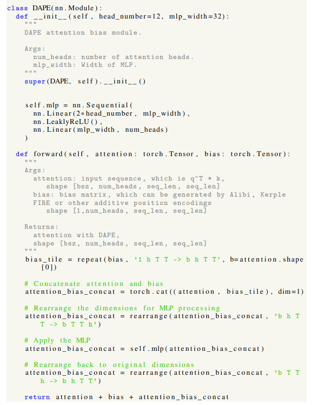 是一个隐式函数,它将语义和位置信息整合为所需的位置编码。因此,结合 DAPE 的 softmax 前注意力 logit 公式如下: