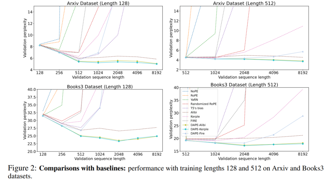 在长度外推上更好的效果。与 ALiBi、Kerple 和 FIRE 相比,DAPE 显著提升了长度外推(length extrapolation)性能。在不同长度的训练和评估中,DAPE-Kerple 明显超越 Kerple 等竞争对手。在 Arxiv 数据集上,训练长度为 128 时,DAPE-Kerple 在评估长度为 8192 时达到了惊人的低困惑度 5.00,而 Kerple 的困惑度为 31.93。同样,在 Books3 数据集上,训练长度为 512 时,DAPE-Kerple 在相同的扩展评估长度下的困惑度为 17.88,远远优于 Kerple 的 39.31。这些结果证明,DAPE 通过其语义适应性和灵活性,持续提升了超出训练长度的性能,超越了静态位置编码方法。