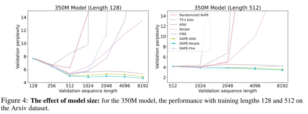 在训练长度内更好的效果。DAPE 增强了在序列长度内部的表现,表明其较低的困惑度可能来自对整个句子的充分利用,而不是忽视长距离信息。与 ALiBi、Kerple 和 FIRE 相比,改进后的版本 DAPE-ALiBi、DAPE-Kerple 和 DAPE-FIRE 在序列长度内部的表现始终显著更好。随着序列长度的增加,ALiBi 往往从全局注意力过渡到几乎局部的注意力,这就是为什么 ALiBi 在训练长度内的表现比大多数基线差,但在超出训练长度后表现更好的原因。结果表明 DAPE 在序列长度内部的优越表现具有统计显著性,p 值小于 0.05。因此,在不同训练长度 (长度 128,512 以及 1024) 中的表现表明,DAPE 较低的困惑度是由于它有效利用了整个序列,而不是仅关注局部部分并忽视长距离信息。