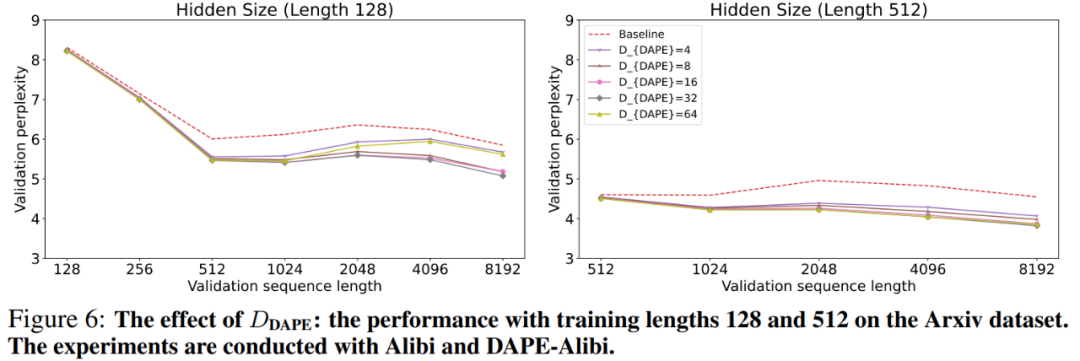 设置为 4 时,DAPE-ALiBi 在评估长度为 128 时的困惑度为 8.25,在评估长度为 8192 时为 5.67,均优于 ALiBi 的 8.31 和 5.85。不论 hiddien dimension 设置为 4、16、32 或 64,DAPE 的性能在所有评估长度上都优于原始 ALiBi。这表明即使使用较小的
