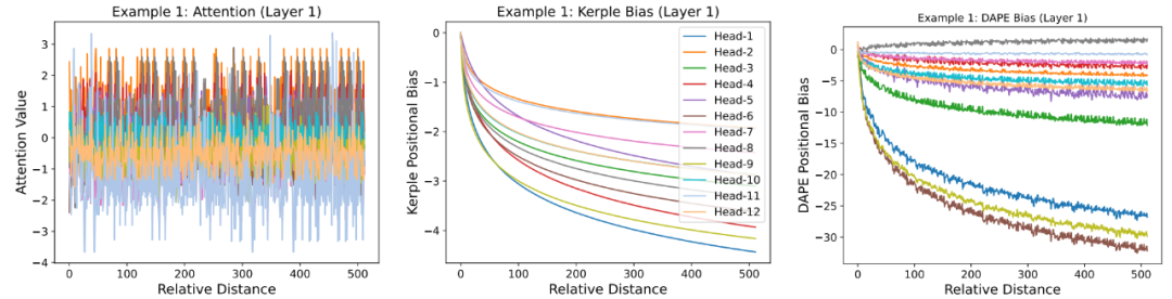 DAPE 展现 local pattern 和 anti-local pattern. 我们在图 1 中绘制了第 8192 个位置的查询 token 的学习位置编码偏置,涵盖了所选层中的所有注意力头。我们想强调 DAPE 的两个特点。首先,与固定的局部归纳偏置(如 Kerple 和 ALiBi)相比,DAPE 的偏置矩阵在不同的注意力头中,能够学习到既包含局部注意力模式,又包含 “反局部” 注意力模式 (DAPE Bias Head-8),强调更远的 key(类似于 FIRE)。其次,与为所有注意力固定的静态偏置相比,DAPE 的偏置矩阵可以根据不同的注意力值动态调整。