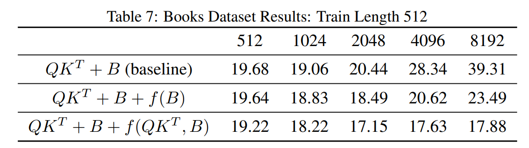 我们进一步对函数 f 进行了消融研究,证明 f 有助于增强偏置矩阵。DAPE(动态位置编码)改进了偏置矩阵,使得最终的注意力矩阵