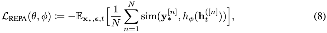 - REPA 的核心是将扩散模型的隐藏状态与预训练表征对齐,这可以通过最大化它们的相似性来实现。