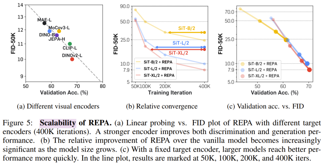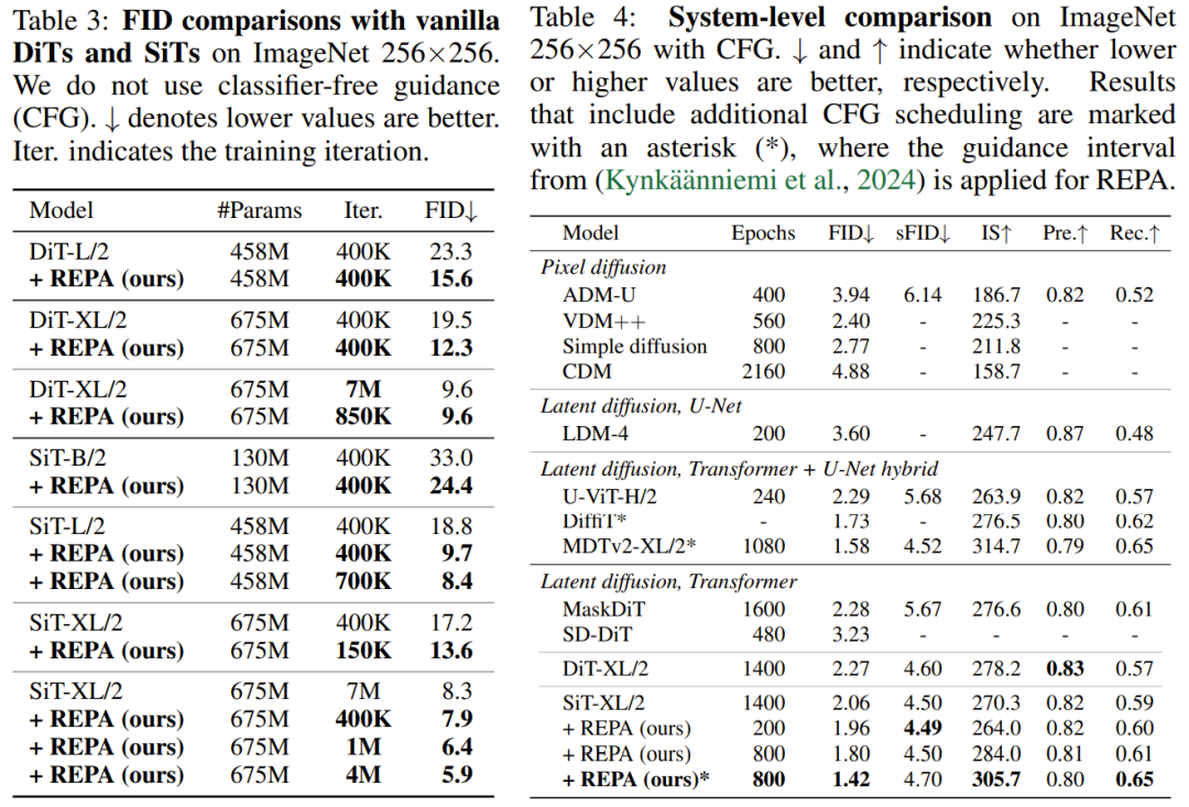 - 实验表明,REPA 在不使用无分类器引导的情况下,可以在 400K 次迭代时实现 FID=7.9,优于普通模型在 700 万次迭代时的性能。