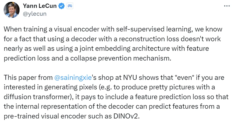 Yann LeCun 也对他们的研究表示了认可:「我们知道,当使用自监督学习训练视觉编码器时,使用具有重构损失的解码器的效果远不如使用具有特征预测损失和崩溃预防机制的联合嵌入架构。这篇来自纽约大学 @sainingxie 的论文表明,即使你只对生成像素感兴趣(例如使用扩散 Transformer 生成漂亮图片),也应该包含特征预测损失,以便解码器的内部表征可以根据预训练的视觉编码器(例如 DINOv2)预测特征。」