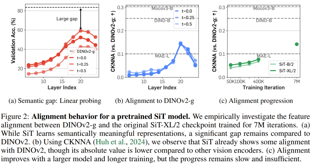 他们研究了在 ImageNet 上预训练得到的 SiT(可扩展插值 Transformer)模型的逐层行为,该模型使用了线性插值和速度预测(velocity prediction)进行训练。他们研究的重点是扩散 Transformer 和当前领先的监督式 DINOv2 模型之间的表征差距。他们从三个角度进行了研究:语义差距、特征对齐进展以及最终的特征对齐。
