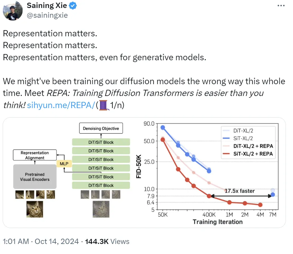 原文标题:扩散模型训练方法一直错了!谢赛宁:Representation matters