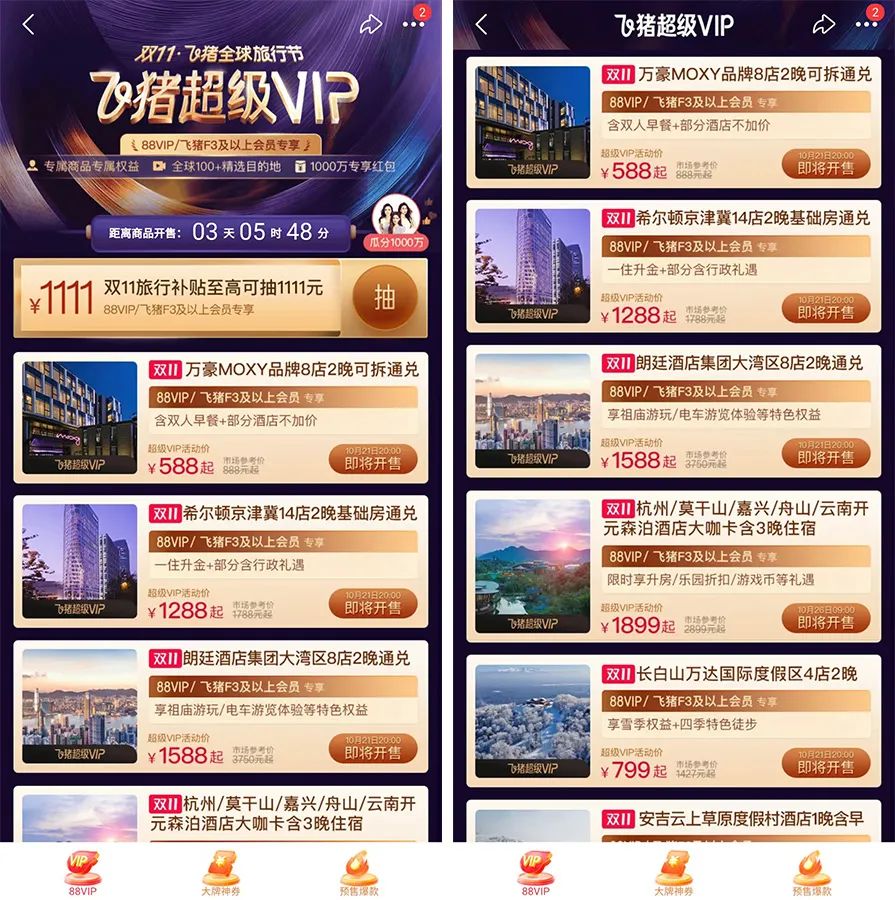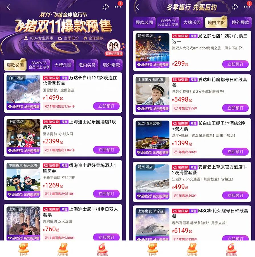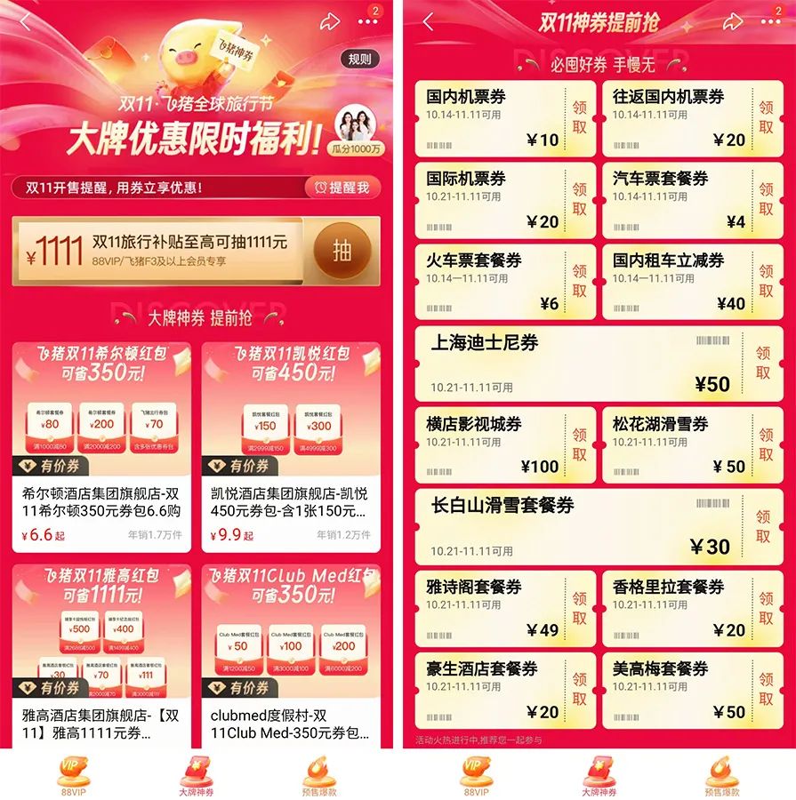 飞猪大促集合页,一站式囤好货,大牌神券、预售爆款、88vip专属,双11优惠全掌握!