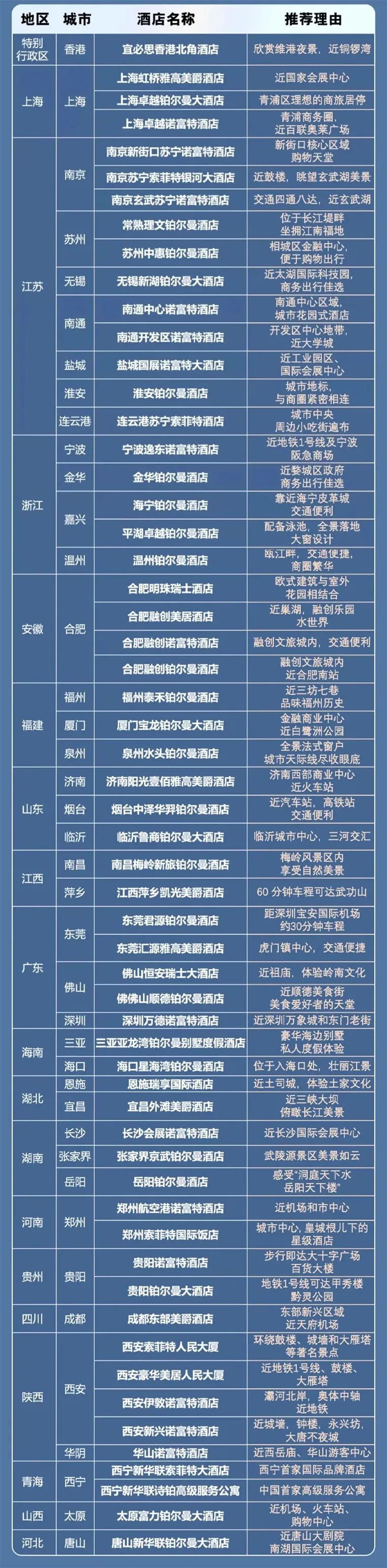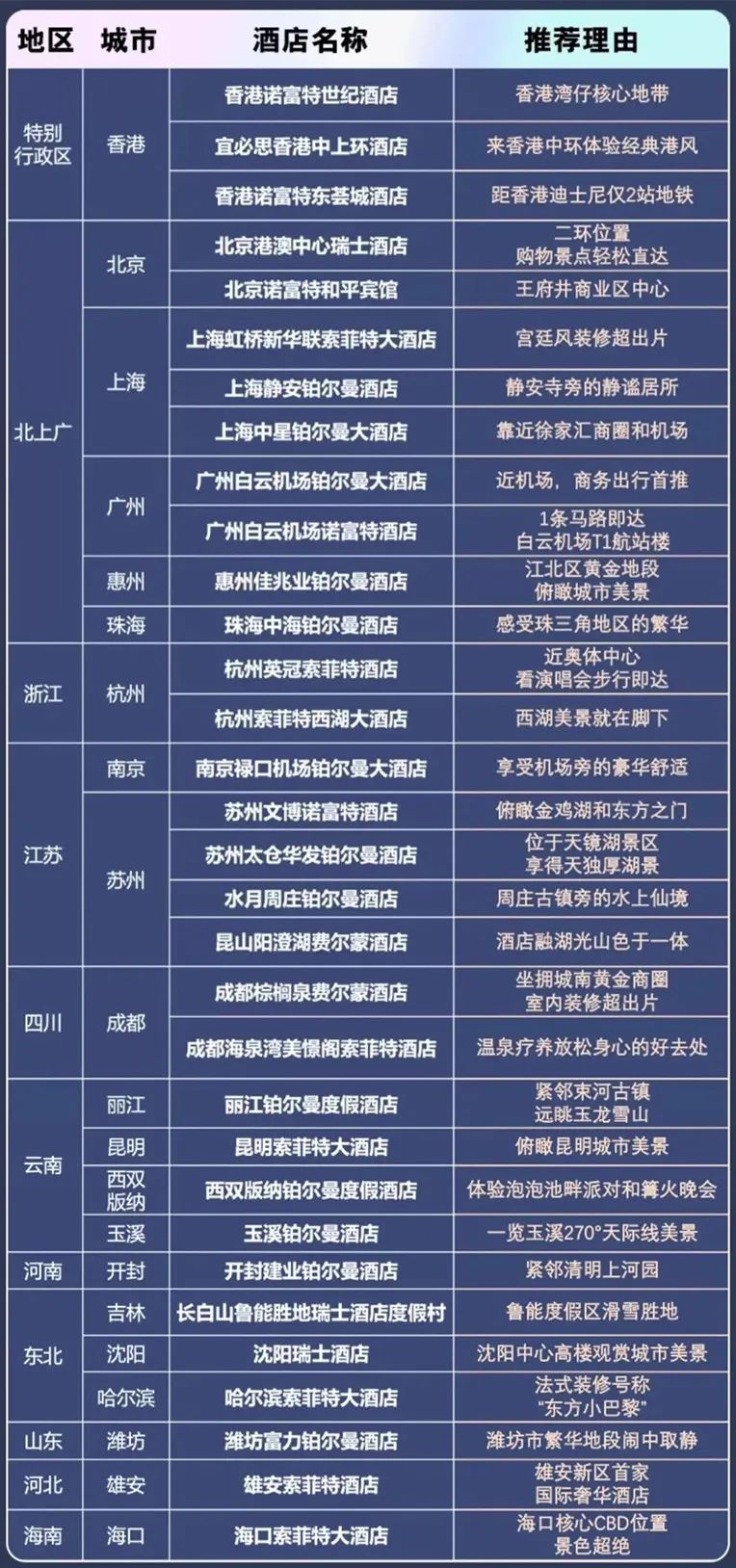 香港的门店也有,宜必思北角,这家门店靠近铜锣湾,维多利亚公园向东一些,试一下维港海景酒店,1099元3晚的价格想都不敢想!南京C位酒店都包园了,靠近新街口的新街口苏宁诺富特,靠近玄武湖的索菲特银河和玄武诺富特。连海南的三亚亚龙湾铂尔曼也包含进来!跟雅高的亚洲旗舰酒店西安索菲特传奇在一起的索菲特人民大厦也在里面!
