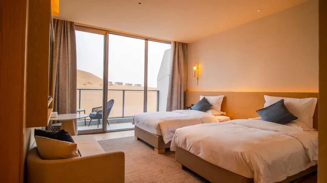 沙景房是沙漠星星大五角星的主楼区域,更暖和,景观也更好。很多人来住这两家酒店都是为了看冬天的半沙半雪,住沙景房,一开窗帘,外面就是。