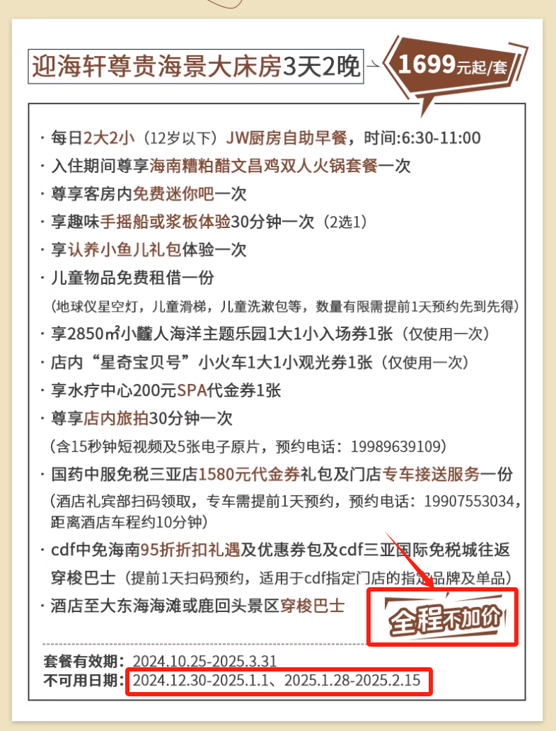 高级豪华房2晚+2大2小自助早餐+迷你吧1次+午餐套餐1次,1699元。春节期间不可用,11月不加价。