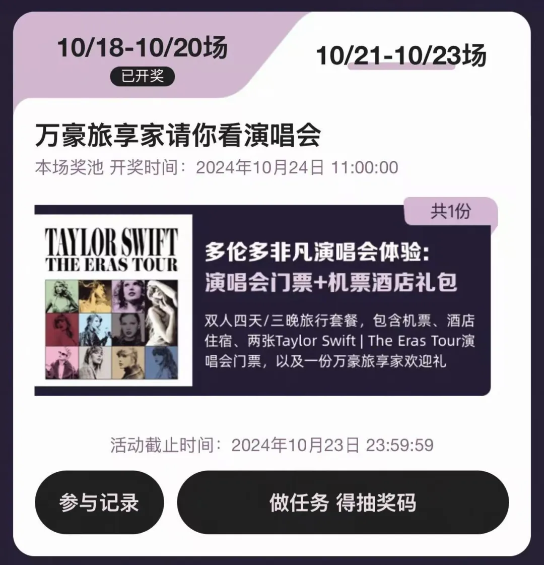 2、完成挑战,抽泰勒·斯威夫特多伦多演唱会双人门票+往返机票+酒店住宿+旅享家欢迎礼!