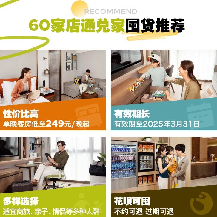 全国60家惠庭门店可选,涵盖了北京、重庆、成都、杭州、西双版纳、汕尾、福州、贵阳等40个热门城市,部分酒店还紧邻热门景区,位于商圈中心。