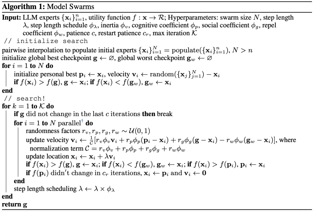 MODEL SWARMS 通过群体智能来适应 LLM 专家,图 1 和算法 1 概述了 MODEL SWARMS。