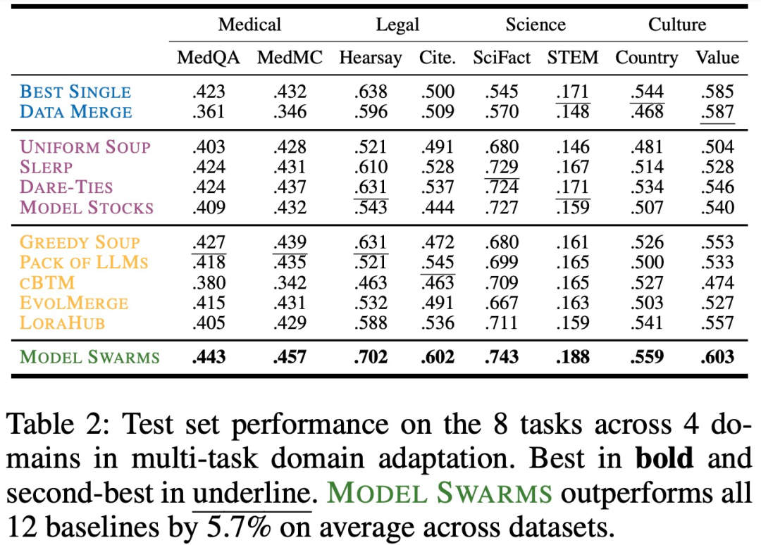 在多任务方面,下表 2 展示了 MODEL SWARMS 跨 8 个任务和 4 个域的测试集性能: