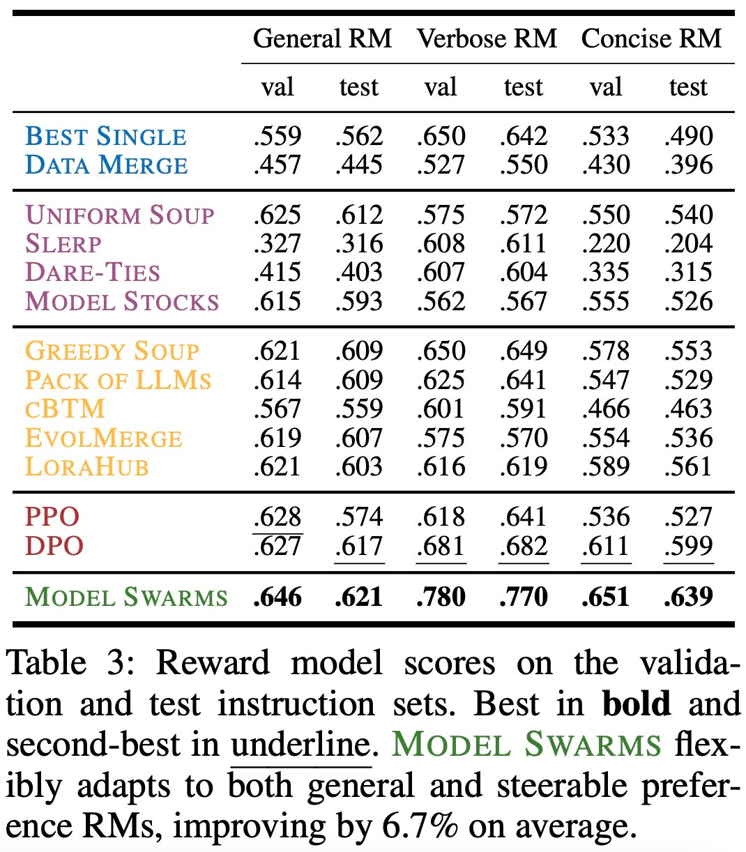 奖励模型:在优化一般和冲突偏好的奖励模型分数时,MODEL SWARMS 提供了可控性更高的专家,与基线相比在可控性上提高了高达 14.6%。