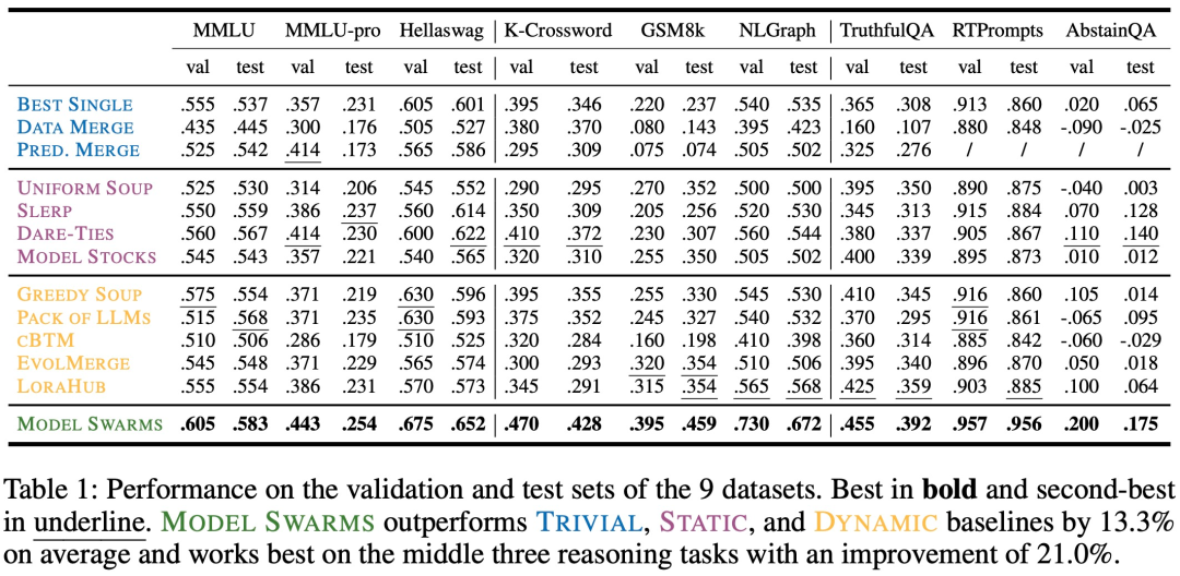 如下表 1 所示,MODEL SWARMS 在所有 9 个单一任务上都实现了 SOTA 性能: