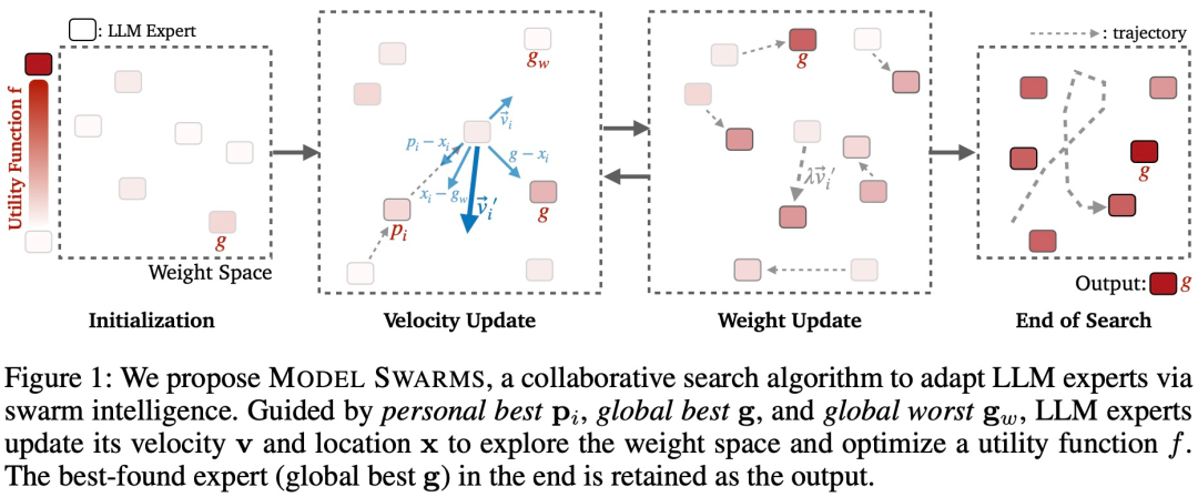 粒子的位置和速度使 LLM 专家能够主动搜索而不是被动合并,而个体 / 全局最佳检查点有助于跟踪权重空间中的良好位置和邻域以进一步探索。