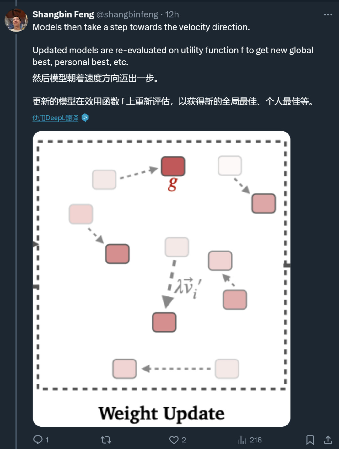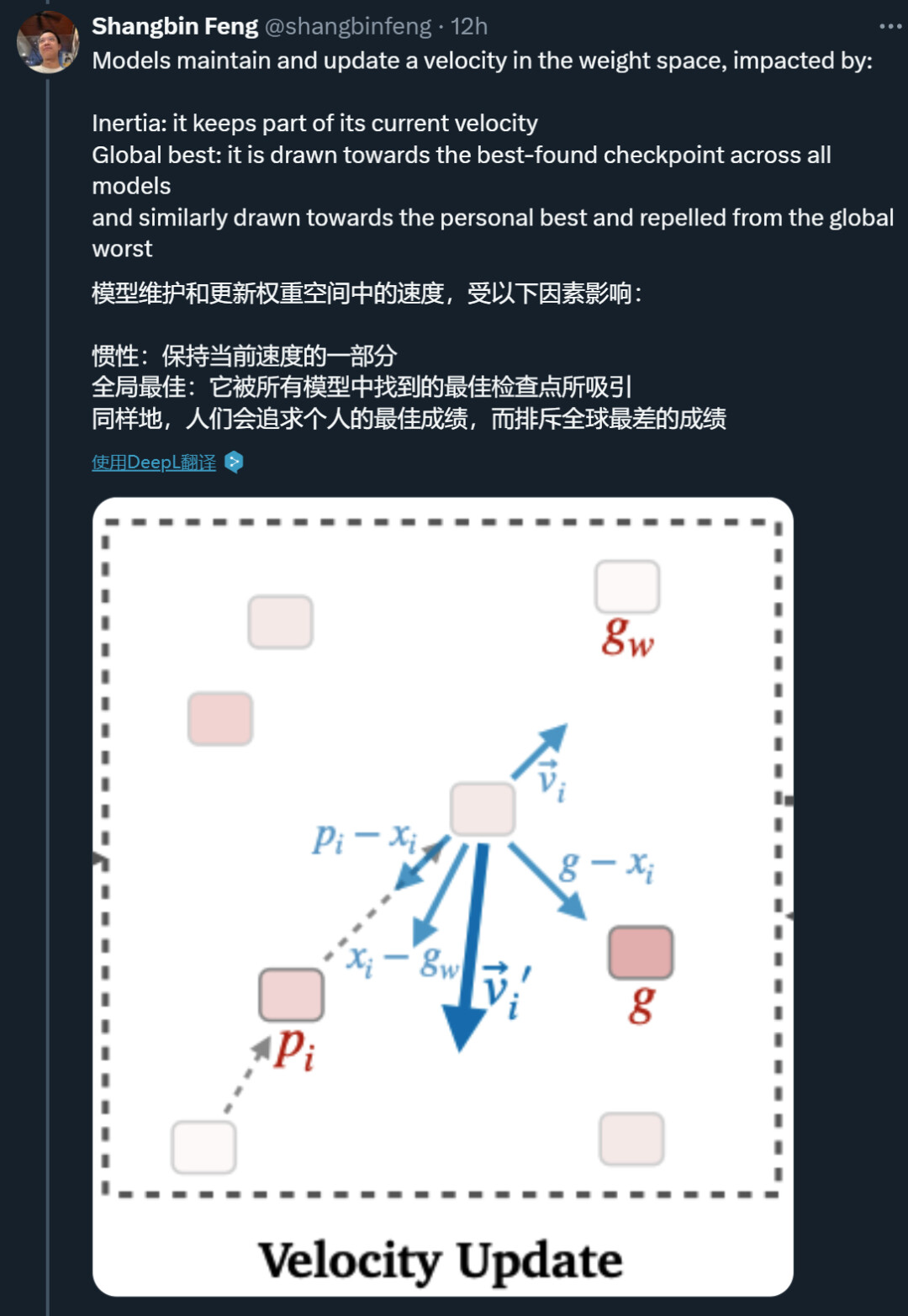 每个粒子都有一个速度、模型权重空间中应该朝下一个粒子移动的方向;