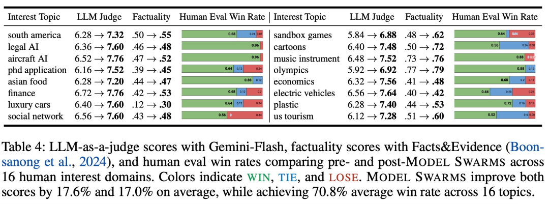 在 16 个人类兴趣主题上,MODEL SWARMS 前后的 LLM-as-a-judge 分数、事实性分数如下表 4 所示: