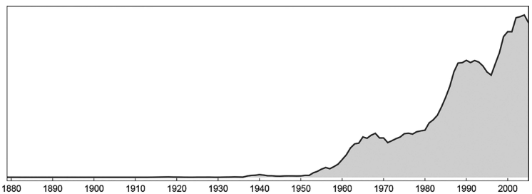 但是,让布尔的名字如此广为人知的并不是布尔代数,而是更为简单的布尔变量概念,它基本上出现在每一种计算机语言之中,这导致自 20 世纪 50 年代以来,出版物中提及“布尔”一词的次数逐渐增多: