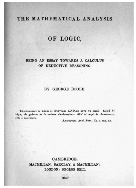 1847 年初,布尔的朋友奥古斯塔斯·德·摩根(Augustus DeMorgan)因这个问题卷入了一场学术上的纠纷。这使布尔很快开始着手研究他早先提出的关于如何用数学来表述逻辑的想法。