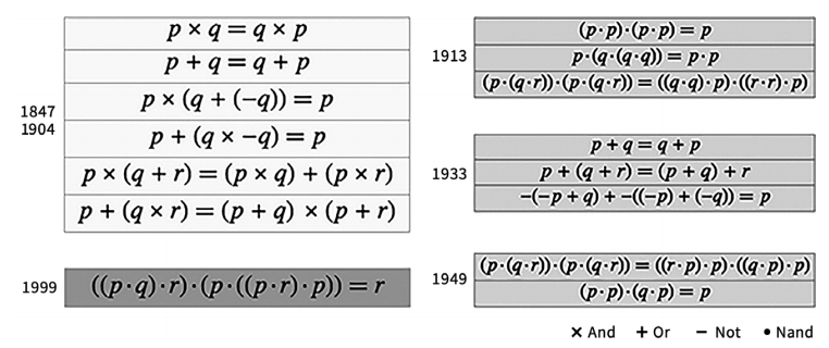 布尔描述其公理系统的方式相当随意。但在几十年内,它已经被更加精确地形式化了,在随后的一个世纪里,人们又逐渐发现了一些更为简洁的形式。然后,巧合的是,16 年前,我终于结束了这个长达 150 年的过程,我发现了一个可以证明的最简单的逻辑公理系统,它实际上只包含一个公理——很大程度上来说这只是我所从事的其他科学的一个附带产物。