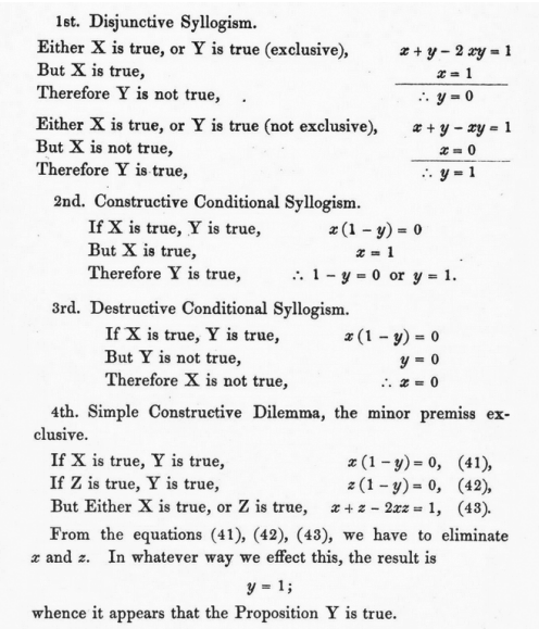 如今来看布尔的书,大部分内容都很容易理解。例如,他在书中展示了他的代数公式是如何再现逻辑学中的一些标准结果的: