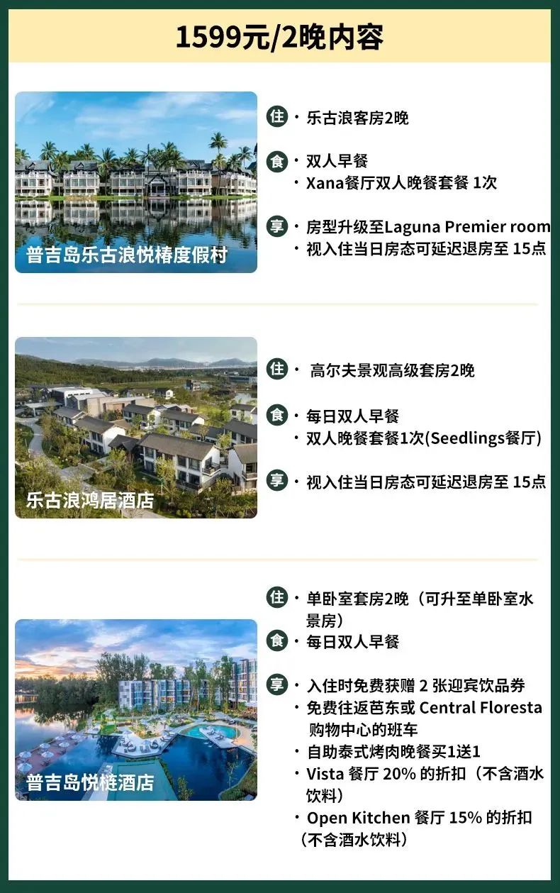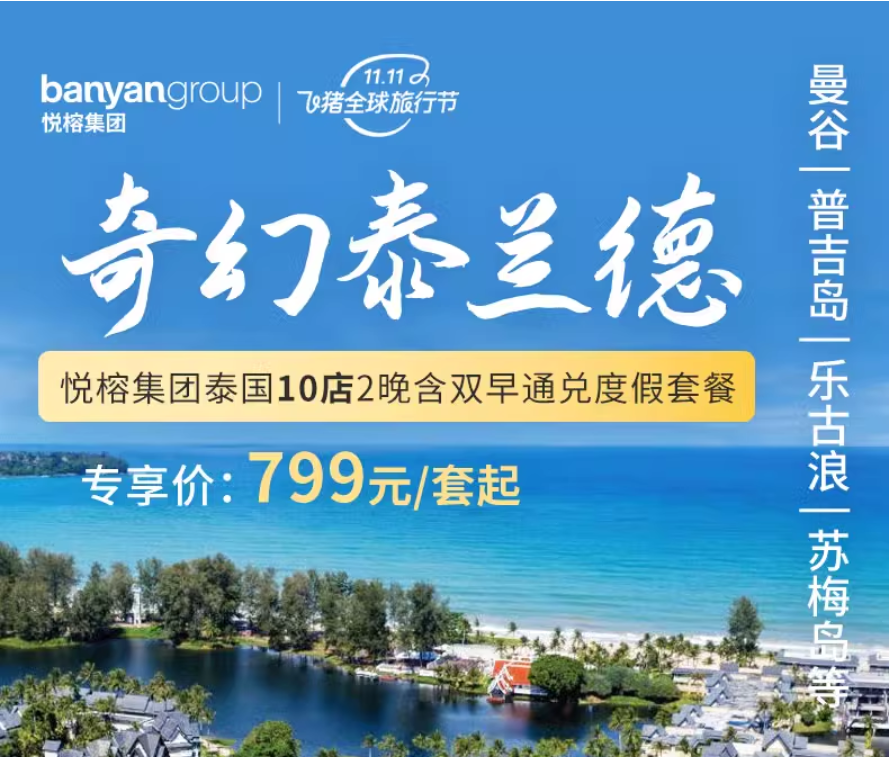 悦榕集团泰国10店2晚通兑度假套餐=799元起
