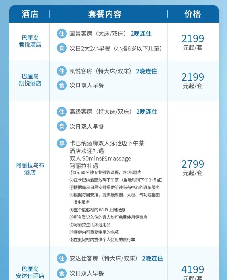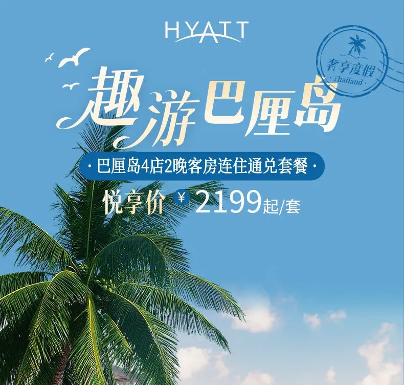 凯悦巴厘岛4店2晚连住度假通兑套餐=2199元起(全程不加价)