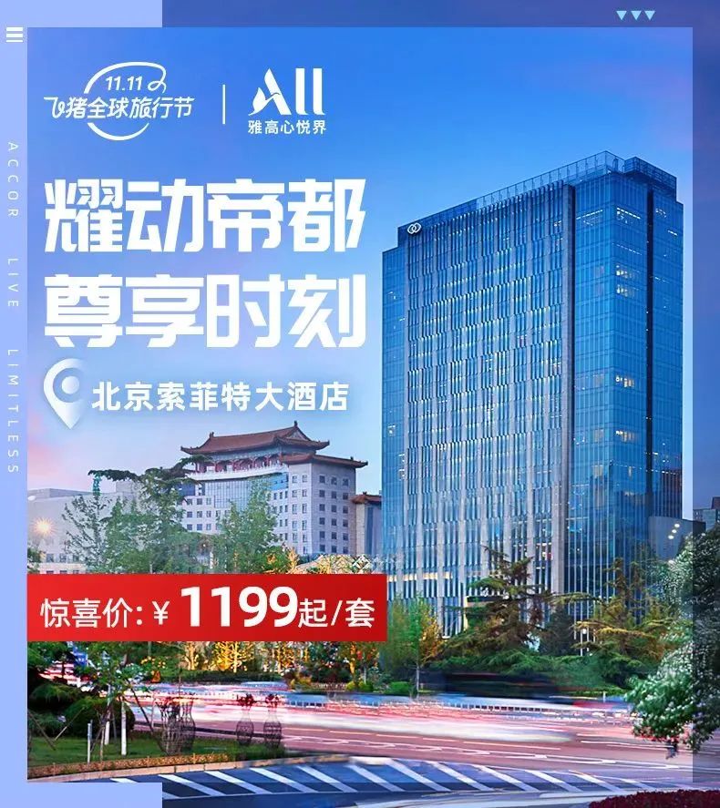 * 北京索菲特豪华房1-3晚含2大2小早餐=1199元起,除春节外不加价