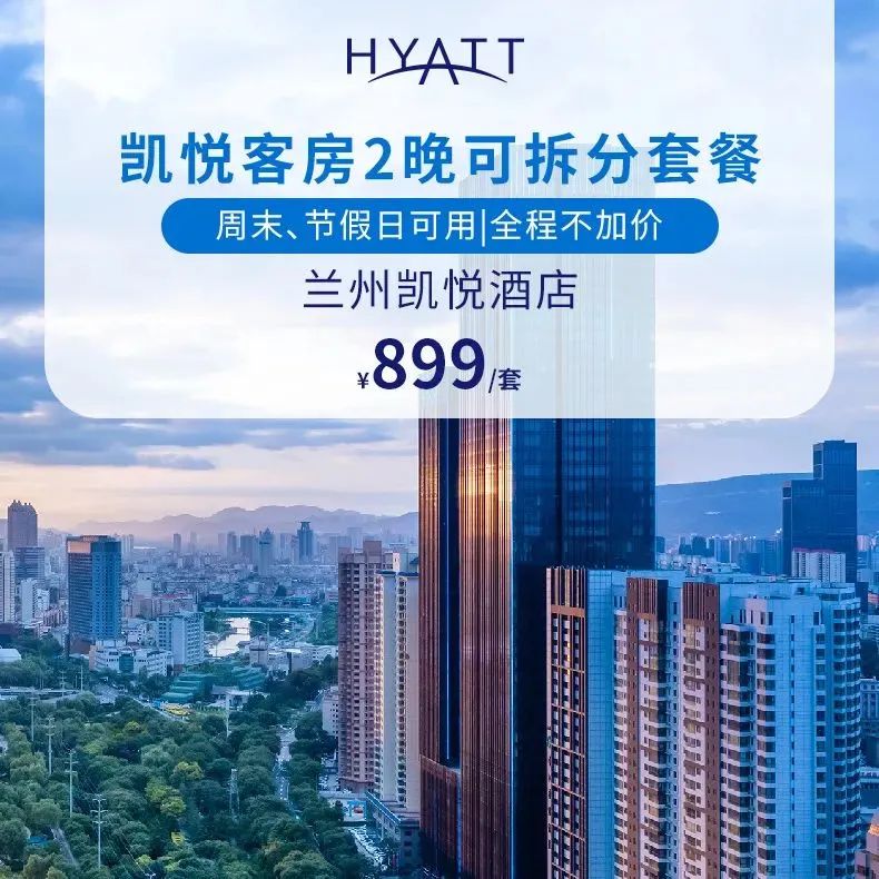 兰州凯悦酒店2晚可拆分凯悦客房纯享套餐=899元起(全程不加价)