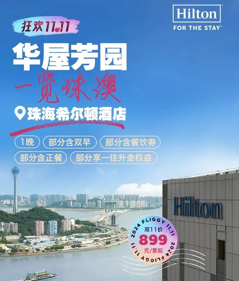 * 珠海希尔顿酒店1晚(含899元餐消)=899元起,相当于不要钱