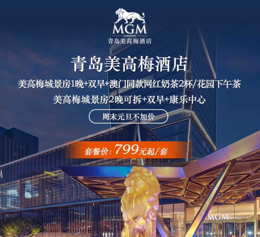 青岛美高梅酒店城景房1-2晚含早元气套餐=券后749元起(周末元旦不加价)