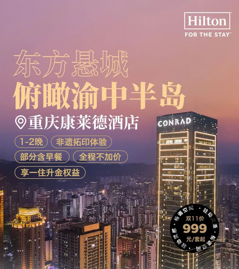 一住升金!重庆康莱德酒店1-2晚套餐=999元起(全程不加价)