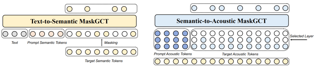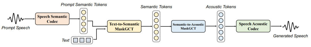 MaskGCT 是一种全非自回归 TTS 模型,无需文本与语音的对齐监督和音素级持续时间预测。它通过预测从语音自监督学习(SSL)模型中提取的语义标记,进而预测声学标记,实现高质量的文本到语音合成。