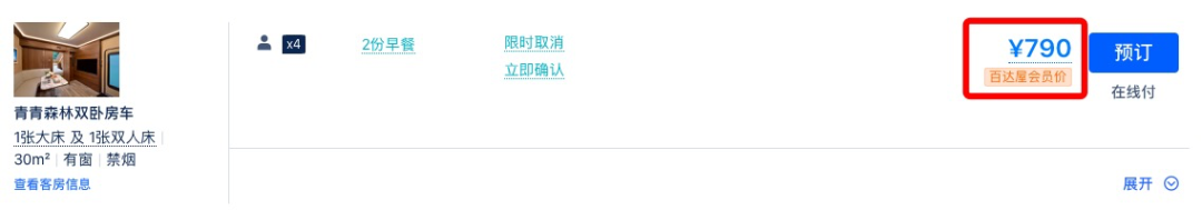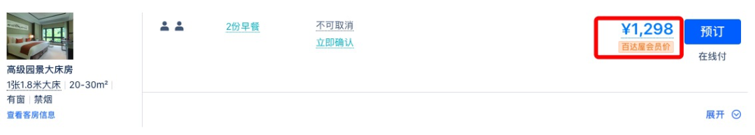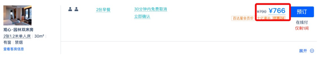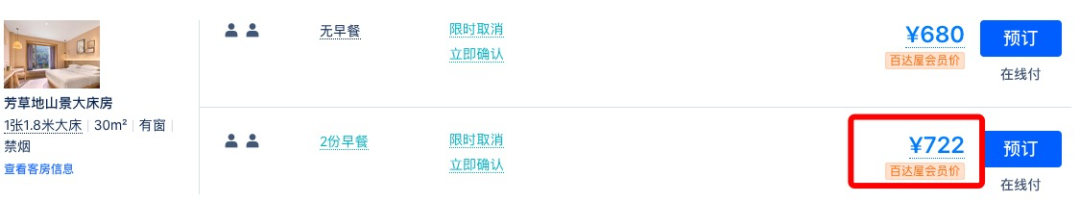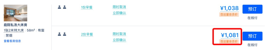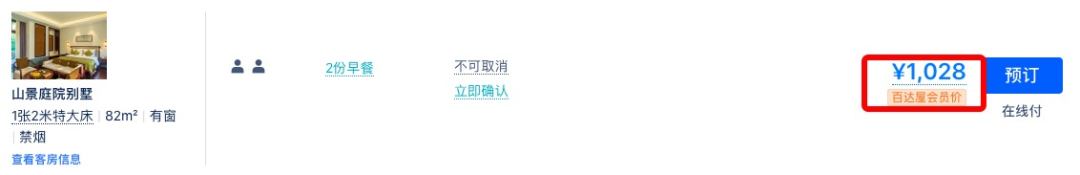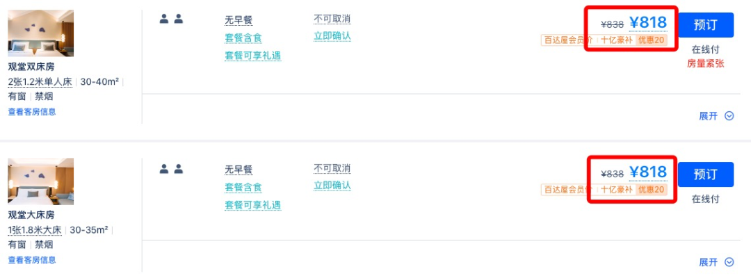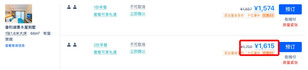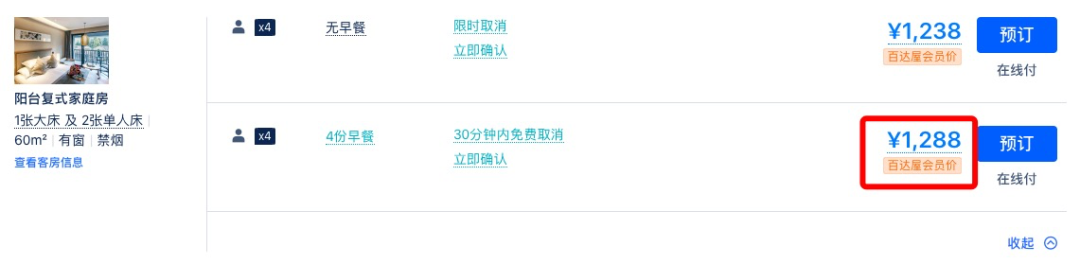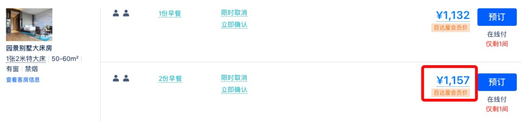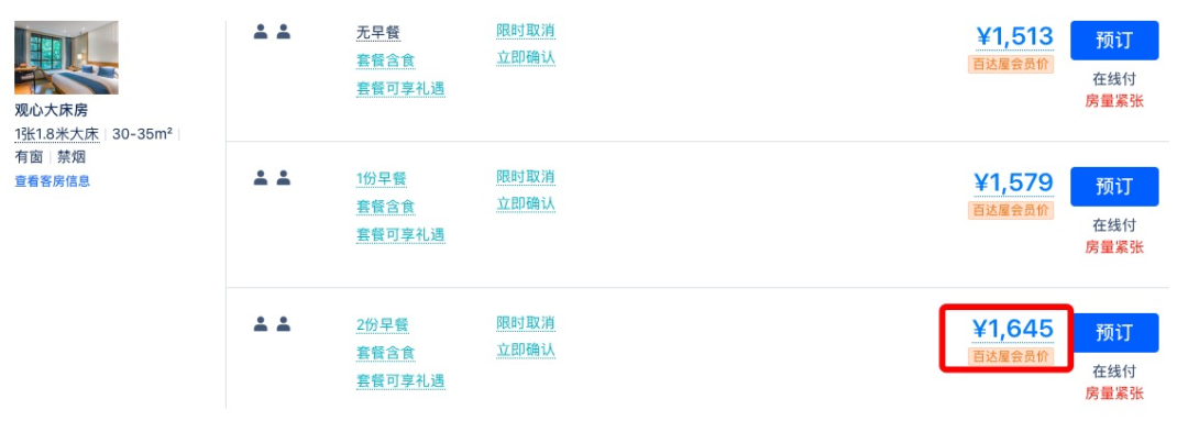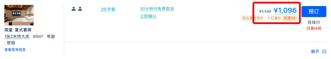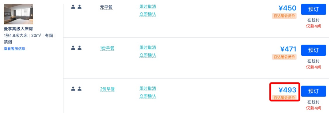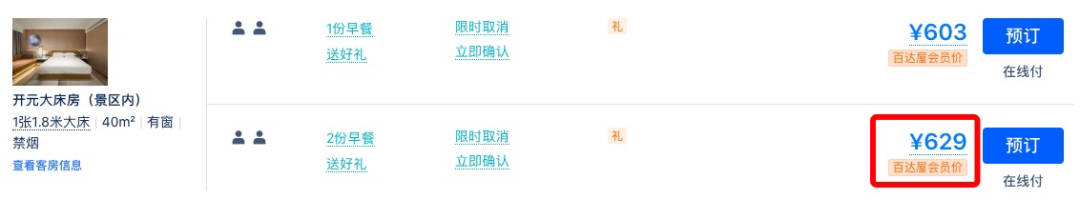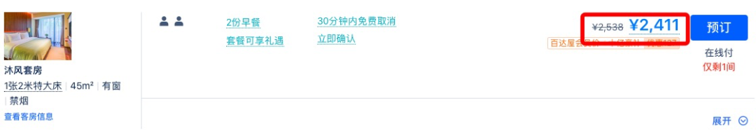 同款日历房价近500元/晚,套餐约为4折,全程不加价。