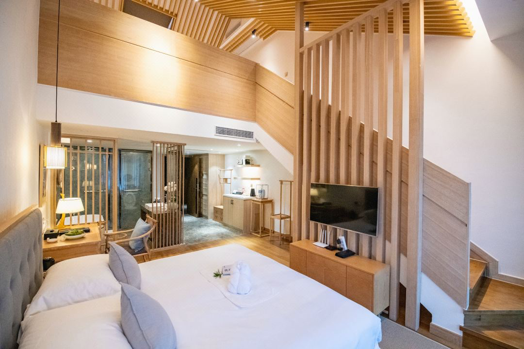 复式套房面积65平米,一层是客厅,二层是卧室,对于亲子家庭来说更加宽敞。日历房价近1100元/晚,套餐约为6折。